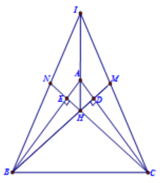 d) Trên tia đối của tia \(EH\) lấy điểm \(N\) sao cho \(NH < HC;\) Trên tia đối của tia \(DH\) lấy điểm \(M\) sao cho \(MH = NH.\) Chứng minh các đường thẳng \(BN;AH;CM\) đồng quy.