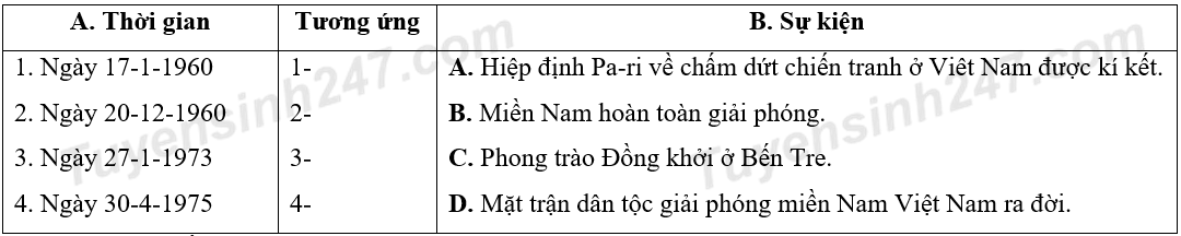 Hãy ghép mốc thời gian ở cột A với sự kiện ở cột B sao cho phù