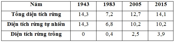 Cho bảng số liệu sau: Biến động diện tích rừng của nước ta qua một số năm (Đơn vị: