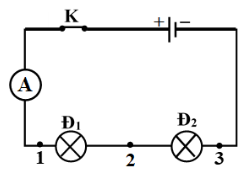 Cho mạch điện có sơ đồ như hình vẽ, trong đó ampe kế có số chỉ \(0,35A\), hiệu điện thế giữa hai đầu đèn Đ1 là \({U_{12}} = 3,2V\) và hiệu điện thế giữa hai đầu đèn Đ2 là \({U_{23}} = 2,8V\). Hãy: