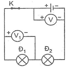 Cho mạch điện có sơ đồ như trên hình vẽ trong đó vôn kế \(V\) có số chỉ \(6,2V\); vôn kế \({V_1}\) có số chỉ \(3,2V\). Hãy tính hiệu điện thế giữa hai đầu bóng đèn Đ2.
