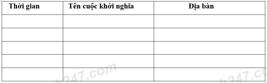 Lập bảng về những cuộc khởi nghĩa tiêu biểu của nông dân Đàng Ngoài trong khoảng 30 năm giữa thế kỉ XIX theo mẫu sau:
