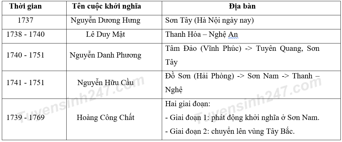 Lập bảng về những cuộc khởi nghĩa tiêu biểu của nông dân Đàng Ngoài trong khoảng 30 năm