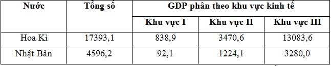 Cho bảng số liệu: GDP PHÂN THEO KHU VỰC KINH TẾ CỦA HOA KÌ VÀ NHẬT BẢN, NĂM 2014 (Đơn vị: Tỉ