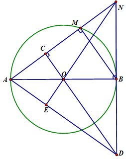 Cho nửa đường tròn \((O;R)\) có đường kính AB. Vẽ đường thẳng d là tiếp tuyến của \((O)\) tại B. Trên cung AB lấy điểm M tùy ý (M khác A, B), tia AM cắt đường thẳng d tại N. Gọi C là trung điểm của đoạn thẳng AM, tia CO cắt đường thẳng d tại điểm D.