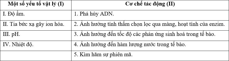 Cho một số yếu tố vật lý (cột I) và cơ chế tác động (cột II)