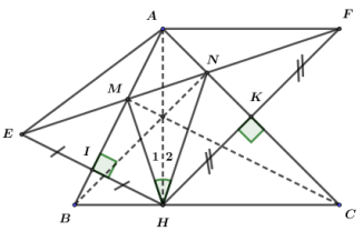 c) \(\begin{array}{l}cm:\,\Delta AEM = \Delta AHM \Rightarrow \angle E = \angle {H_1}\\cm:\,\Delta AFN = \Delta AHN \Rightarrow \angle F = \angle {H_2}\end{array}\)