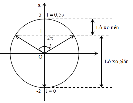 Một con lắc lò xo treo thẳng đứng, lò xo nhẹ có độ cứng \(100\,\,N/m\), vật nặng có khối lượng \(m = 100\,\,g\). Lấy \(g = 10\,\,m/{s^2};\,\,{\pi ^2} = 10\). Kéo vật xuống khỏi vị trí cân bằng theo phương thẳng đứng \(2\,\,cm\) rồi buông nhẹ cho vật dao động điều hòa. Thời gian lò xo bị nén trong khoảng thời gian \(0,5\,\,s\) kể từ khi thả vật là:
