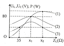 Đặt điện áp xoay chiều u = U\(\sqrt{2}\) cosωt V) (trong đó U và ω không đổi) vào hai đầu đoạn mạch gồm điện trở thuần R, tụ điện C và cuộn cảm thuần có độ tự cảm L mắc nối tiếp. Cho U = y (đo bằng V), R = y ( đo bằng Ω) và độ tự cảm L thay đổi được. Khi cho độ tự cảm L thay đổi thì đồ thị của điện áp hiệu dụng giữa hai đầu cuộn cảm UL (đường 1), điện áp hiệu dụng giữa hai đầu tụ điện UC (đường 2) và công suất tiêu thụ trung bình của đoạn mạch P (đường 3) phụ thuộc vào cảm kháng như hình vẽ. Biết tại giá trị x1 thì UC và P đạt cực đại, tại giá trị x2 thì UL đạt cực đại. Giá trị của R bằng