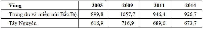 Căn cứ vào bảng số liệu, cho biết nhận xét nào sau đây đúng về số lượng bò giữa Trung du và miền núi Bắc Bộ và Tây Nguyên, giai đoạn 2005 - 2014?