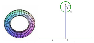 Người ta làm một chiếc phao như hình vẽ (với bề mặt có được bằng cách quay đường tròn \(\left( C \right)\) quanh trục \(d\)). Biết \(OI = 30cm,\,\,R = 5cm\). Tính thể tích \(V\) của chiếc phao.