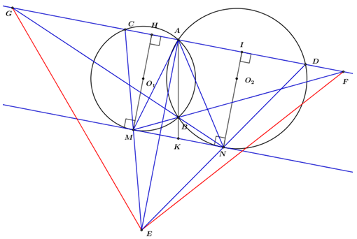 2) Cho \(\left( {{O_1}} \right),\;\;\left( {{O_2}} \right)\) cắt nhau tại 2 điểm A, B. Gọi MN là tiếp tuyến chung của 2 đường tròn với M, N lần lượt thuộc \(\left( {{O_1}} \right),\;\;\left( {{O_2}} \right)\).Qua A kẻ đường thẳng d song song với MN cắt \(\left( {{O_1}} \right),\left( {{O_2}} \right),\;BM,\;BN\) lần lượt tại C,D,F,G. Gọi E là giao của CM và DN. Chứng minh \(EF = EG.\)