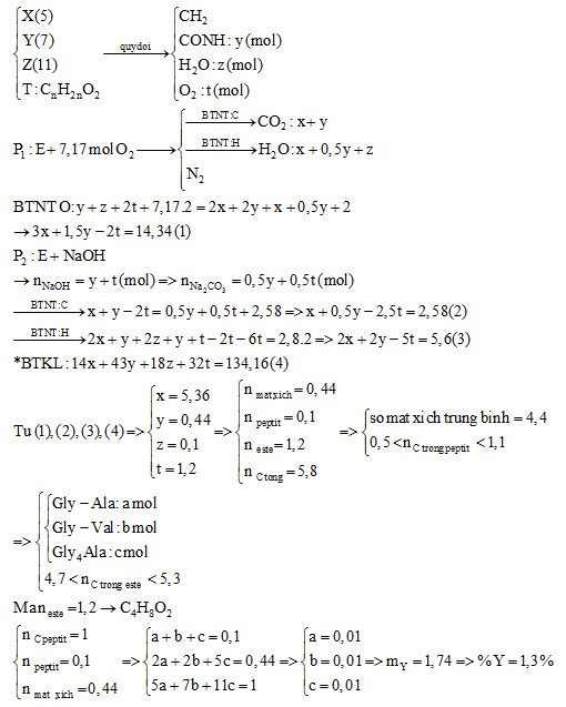 Cho X, Y, Z là ba peptit mạch hở (có số nguyên tử cacbon trong phân tử tương ứng là 5, 7, 11); T là