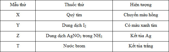 Kết quả thí nghiệm của các dung dịch X, Y, Z, T với thuốc thử được ghi ở bảng sau: