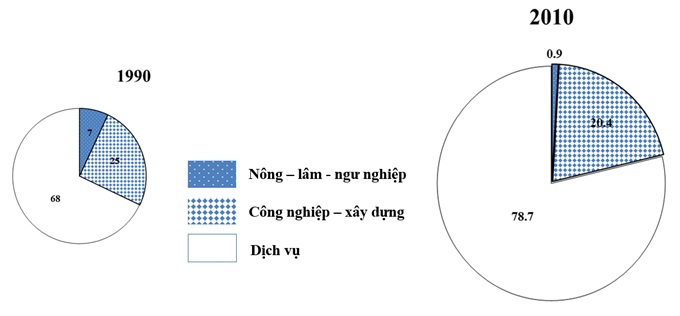 Cho biểu đồ: Cơ cấu GDP của Hoa Kì phân theo khu vực kinh tế năm 1990, 2010. Nhận xét nào sau