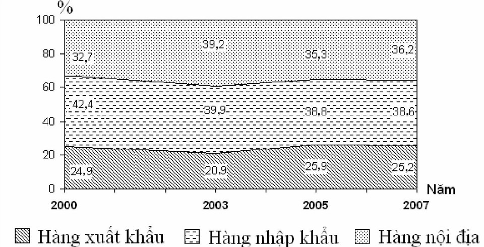 Căn cứ vào biểu đồ, hãy cho biết nhận xét nào sau đây đúng nhất về sự thay đổi cơ cấu khối lượng vận chuyển phân theo loại hàng hóa của nước ta từ năm 2000 đến 2007?