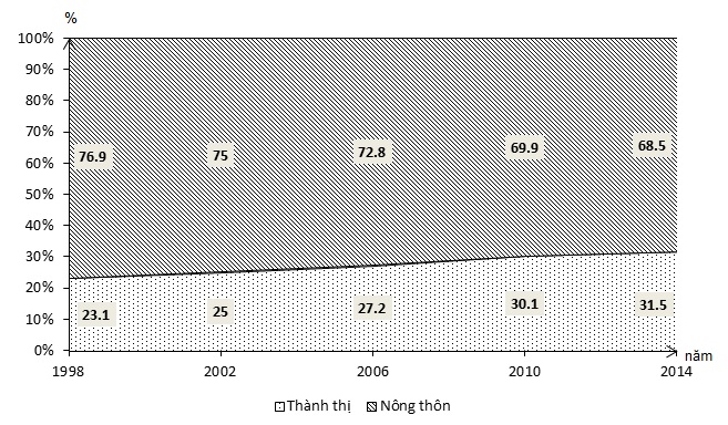 Dựa vào biểu đồ trên cho biết nhận xét nào sau đây không đúng về tỷ trọng dân nông thôn và dân thành thị của nước ta?