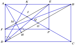 d) Gọi O là giao điểm của AC và BD. Lấy P thuộc AC, dựng hình chữ nhật \(AEPF\;\left( {E \in AB,\;F \in AD} \right).\) BF cắt DE ở Q. Chứng minh rằng: EF // DB và 3 điểm A, Q, O thẳng hàng.