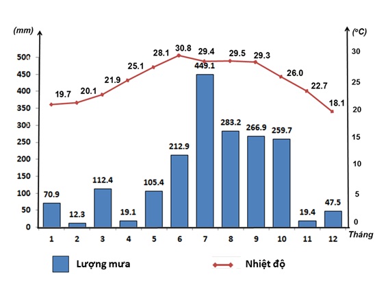 Cho biểu đồ sau về khí hậu Hà Nội năm 2017: Biểu đồ trên thể hiện nội dung nào sau