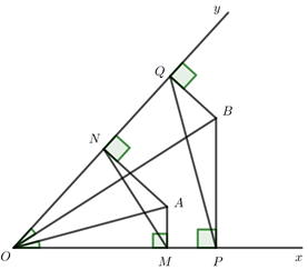 1. Cho hai điểm A, B phân biệt nằm trong góc nhọn xOy sao cho \(\angle xOA = \angle yOB\). Gọi M, N lần lượt là hình chiếu vuông góc của A lên các tia Ox, Oy và P, Q lần lượt là hình chiếu vuông góc của B lên các tia Ox, Oy. Giả sử M, N, P, Q đôi một phân biệt. Chứng minh rằng bốn điểm M, N, P, Q cùng thuộc một đường tròn.