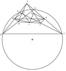 2.Cho tam giác ABC không cân có ba góc nhọn. Một đường tròn đi qua B,C cắt các cạnh AC,AB lần lượt tại D,E. Gọi M,N lần lượt là trung điểm của BD,CE.