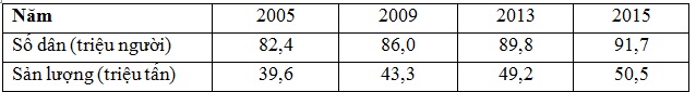 Cho bảng số liệu: SỐ DÂN VÀ SẢN LƯỢNG LƯƠNG THỰC CÓ HẠT NƯỚC TA GIAI ĐOẠN 2005 –