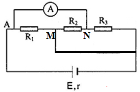 Cho mạch điện như hình vẽ bên. Biết \({R_1} = 1\Omega ,{R_2} = 2\Omega ,{R_3} = 3\Omega \) nguồn điện có suất điện động E = 12V và điện trong không đáng kể. Bỏ qua điện trở của ampekees và dây nối. Hỏi dòng điện chạy qua R2 theo chiều nào và có chỉ số ampeke bằng bao nhiêu