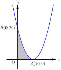Chuẩn bị cho đêm hội diễn văn nghệ chào đón năm mới, bạn An đã làm một chiếc mũ “cách điệu” cho Ông già Noel có hình dáng một khối tròn xoay. Mặt cắt qua trục của chiếc mũ như hình vẽ bên. Biết rằng \(OO' = 5\,cm,\,\,OA = 10\,cm,\,OB = \,20\,cm,\) đường cong \(AB\) là một phần của một parabol có đỉnh là điểm \(A.\) Thể tích của chiếc mũ bằng