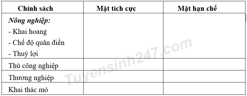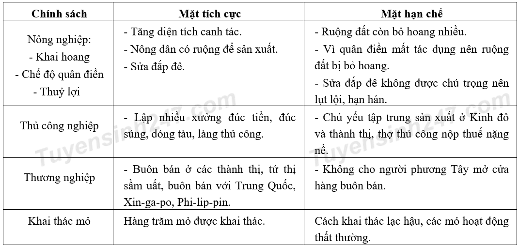 Lập biểu bảng về chính sách kinh tế, chính sách đối ngoại thời Nguyễn có những mặt tích