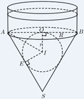 Một cái phễu gồm một phần có dạng hình trụ, bán kính đáy bằng \(R\) và phần còn lại có dạng hình nón, chiều cao bằng \(2R.\) Phễu chứa nước có mực nước đến sát đáy hình nón. Người ta thả vào một một vật hình cầu bằng kim loại vào thì nó đặt vừa khít trong hình nón (hình bên). Chiều cao cột nước dâng lên theo bằng