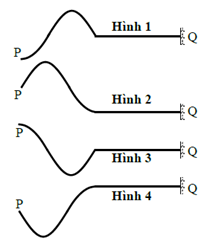 Một sợi dây PQ đàn hồi, dài, được căng ngang. Đầu Q gắn vào tường, còn đầu P gắn vào một cần rung có tần số thấp. Tại thời điểm t = 0, bắt đầu cho cần rung dao động. Khi đó, đầu P bắt đầu dao động điều hòa theo phương thẳng đứng với vận tốc đầu hướng xuống dưới. Chu kì dao động của P là T. Hình vẽ nào trong các hình bên biểu diễn hình dạng sợi dây tại thời điêm t = \(\frac{{3T}}{4}\)?
