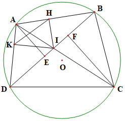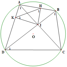 Cho tứ giác ABCD nội tiếp đường tròn (O; R). Gọi I là giao điểm AC và BD. Kẻ IH vuông góc với AB; IK vuông góc với AD (\(H \in AB;K \in AD\)).