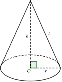 Trong đó : \({S_{xq}}\) : điện tích xung quanh, \(l\) : đường sinh của hình nón, \(r\) : bán kính đáy, \(h\) : chiều cao nón, \(V\) : thể tích hình nón.