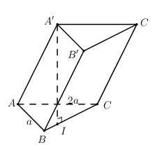 Hình lăng trụ \(ABC.A'B'C'\) có đáy \(ABC\) là tam giác vuông tại \(A,\,\,AB = a,\,\,AC = 2a\). Hình chiếu vuông góc của \(A'\) lên mặt phẳng \(\left( {ABC} \right)\) là điểm \(I\) thuộc cạnh \(BC\). Tính khoảng cách từ \(A\) tới mặt phẳng \(\left( {A'BC} \right)\).