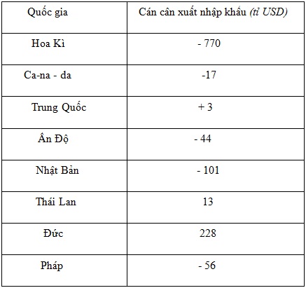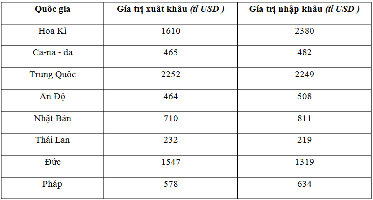Cho bảng số liệu: GIÁ TRỊ XUẤT, NHẬP KHẨU CỦA MỘT SỐ QUỐC GIA NĂM 2014 Các quốc gia nhập