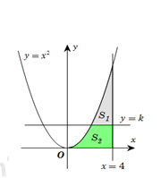 Cho hình phẳng \(\left( H \right)\) giới hạn bởi các đường \(y = {x^2},{\rm{ }}y = 0,{\rm{ }}x = 0,{\rm{ }}x = 4.\) Đường thẳng \(y = k{\rm{ }}\left( {0 < k < 16} \right)\) chia hình \(\left( H \right)\) thành hai phần có diện tích \({S_1},{\rm{ }}{S_2}\) (hình vẽ). Tìm \(k\) để \({S_1} = {S_2}\).