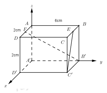Cho hình hộp chữ nhật \(ABCD.A'B'C'D'\), \(AB = 6cm,\,BC = BB' = 2cm\). Điểm \(E\) là trung điểm cạnh