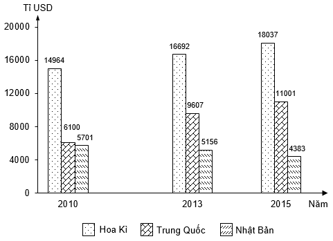 Cho biểu đồ về tổng sản phẩm trong nước của một số quốc gia, giai đoạn 2010 – 2015: