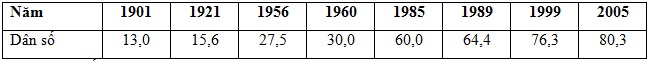 Cho bảng số liệu: DÂN SỐ NƯỚC TA THỜI KÌ 1901 – 2005 (Đơn vị: triệu người) Nhận