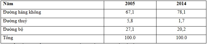 Cho bảng số liệu CƠ CẤU KHÁCH QUỐC TẾ ĐẾN VIỆT NAM PHÂN THEO PHƯƠNG TIỆN VẬN CHUYỂN NĂM
