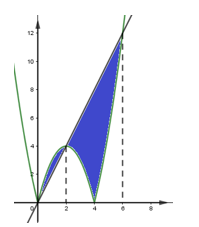 Diện tích hình phẳng giới hạn bởi các đường \(y = \left| {{x^2} - 4x} \right|\) và \(y = 2x\) bằng
