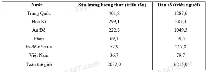 Cho bảng số liệu: BẢNG 1: SẢN LƯỢNG LƯƠNG THỰC VÀ DÂN SỐ CỦA MỘT SỐ NƯỚC TRÊN THẾ