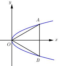 Cho \(\left( P \right):\,\,{y^2} = 4x,\,\,A,B \in \left( P \right)\) để \(\Delta AOB\) đều. Tính \(\left( {{y_A}