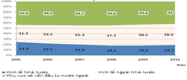 => Biểu đồ thể hiện sự thay đổi cơ cấu giá trị sản xuất công nghiệp theo thành phần kinh tế của nước ta giai đoạn 2005 - 2010.