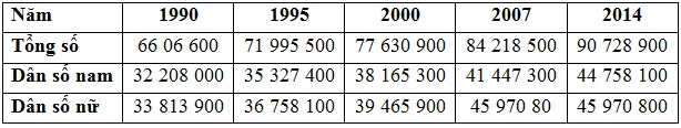 Cho bảng số liệu: DÂN SỐ VIỆT NAM GIAI ĐOẠN 1990 - 2014 (Đơn vị: triệu người) Nhận xét nào