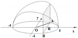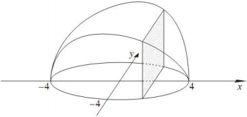 Một vật có kích thước và hình dáng như hình vẽ dưới đây. Đáy là hình tròn giới hạn bởi đường tròn \({x^2} + {y^2} = 16\) (nằm trong mặt phẳng \(Oxy\)), cắt vật bởi các mặt phẳng vuông góc với trục \(Ox\) ta được thiết diện là hình vuông. Thể tích của vật thể là