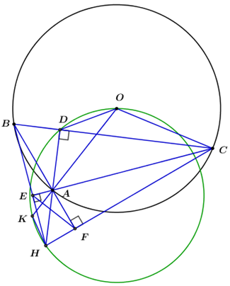Cho tam giác ABC nội tiếp đường tròn tâm (O) có góc A tù, \(AB < AC\) và H là trực tâm của tam giác. Các đường AH, BH, CH lần lượt cắt BC, CA, AB tại D, E, F.