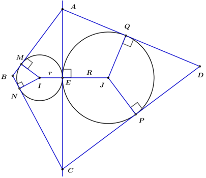 Cho 2 đường tròn (I, r) và (J, R) tiếp xúc ngoài với nhau tại E( r < R) và đường thẳng d là tiếp tuyến tại E của 2 đường thẳng đó. Trên d lấy A và C sao cho E nằm giữa và R < EA < EC. Các tiếp tuyến thứ 2 của (I) vẽ từ A và C cắt nhau ở B, các tiếp tuyến thứ 2 từ (J) vẽ từ A và C cắt nhau ở D. Chứng minh rằng tồn tại 1 điểm cách đều 4 đường thẳng AB, BC, CD, DA.