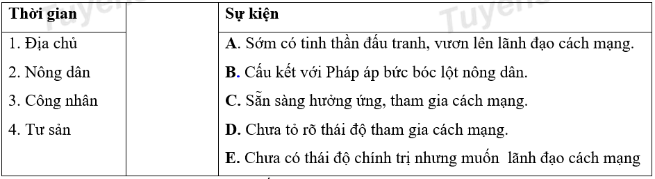 Nối nội dung thời gian với sự kiện tương ứng thể hiện thái độ chính trị của các giai cấp Việt Nam cuối thế kỷ XIX đấu thế kỷ XX.