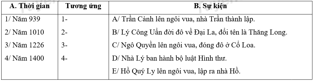 Nối các mốc thời gian ở cột A sao cho tương ứng với sự kiện ở cột